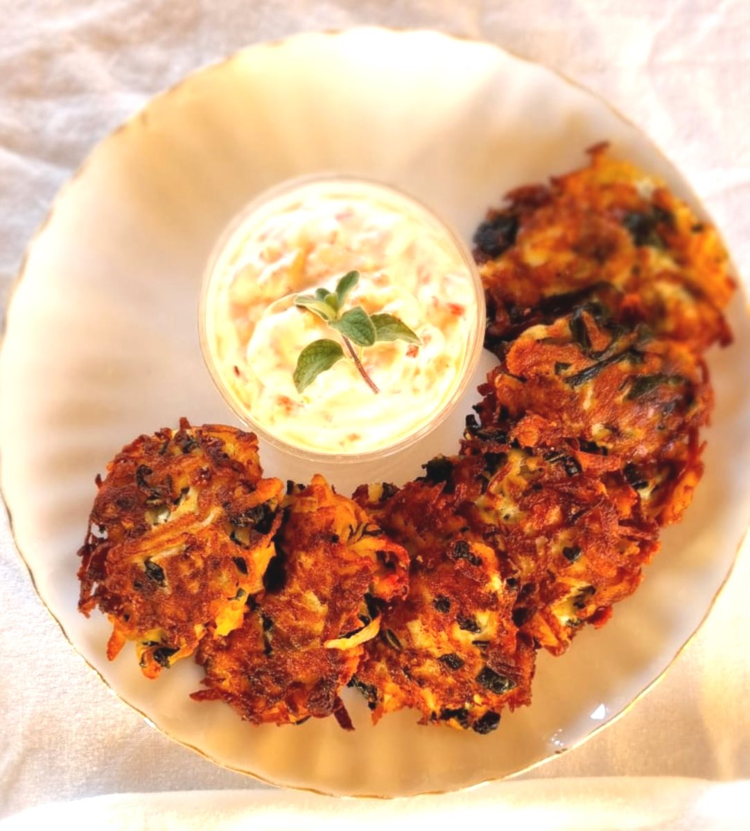 לביבות תפוחי אדמה, מנגולד, קשקבל ופטה, בליווי מטבל שמנת ופלפלים